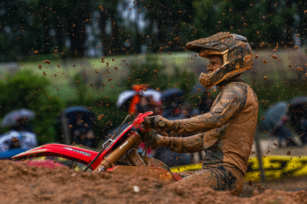 A couple of minutes into the first race, on an already waterlogged track, the heavens opened and the rain was torrential! Chaos ensued, with all riders finding it extremely difficult to control their bikes in the severe mud and water, even finding it hard to ride up the face of what would normally be simple jumps! The track in this condition would not be out of place in an extreme / hard Enduro event. Östlund rode brilliantly under the circumstances and picked his way round and through stricken riders for P11! Click here to see a video of Östlund after the first race.