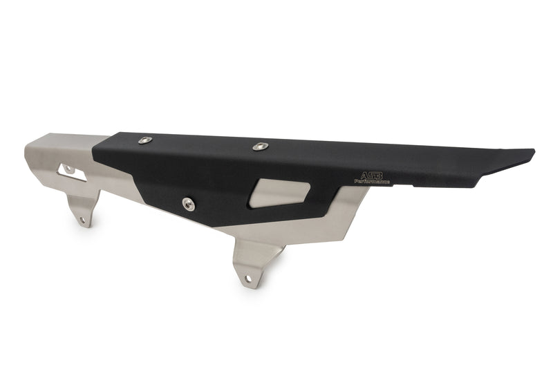 AS3 Performance chain guards are constructed by combining a strong 2mm thick stainless steel mounting bracket to provide excellent protection to the chain and finished off with a lighter aluminium bracket painted in textured black paint with AS3 Performance branding.
