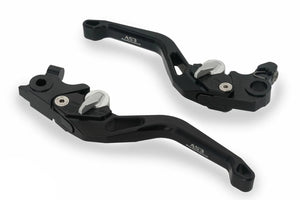 AS3 Performance adjustable front brake and clutch levers are available for a wide range of sports bikes, sports touring bikes and dual sport motorcycles. They are CNC machined from aircraft grade 6061 T6 aluminium and feature a short lever design to allow the rider to control the levers with either 2 or 3 fingers. The levers have 6 adjustable reach settings which can be easily set by using the silver adjuster. They come in a black anodised finish with AS3 Performance branding on the front of the levers.