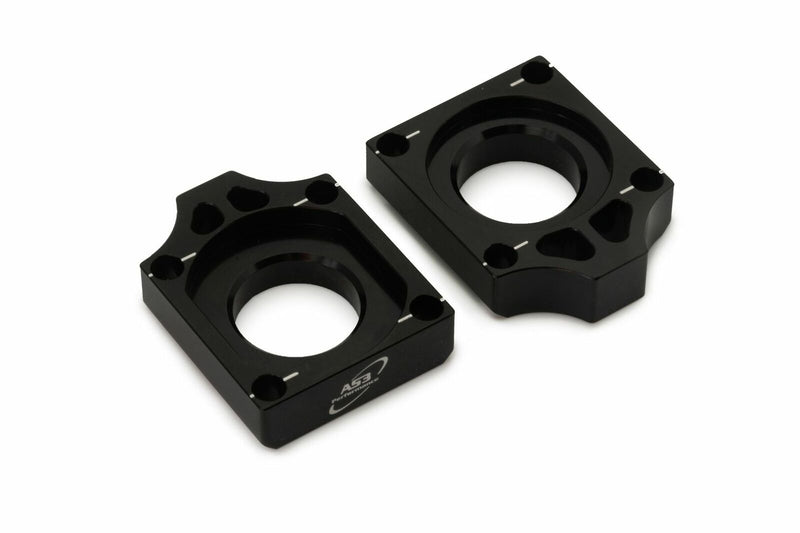 AS3 Performance rear axle blocks are CNC machined from billet aluminium for the perfect fit in the swing arm and around the rear wheel spindle. The alignment scales on the top and bottom of each block are designed to help correctly position the rear wheel. They have a smooth anodised finish and feature AS3 Performance branding on the back of both blocks.