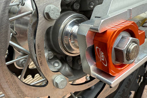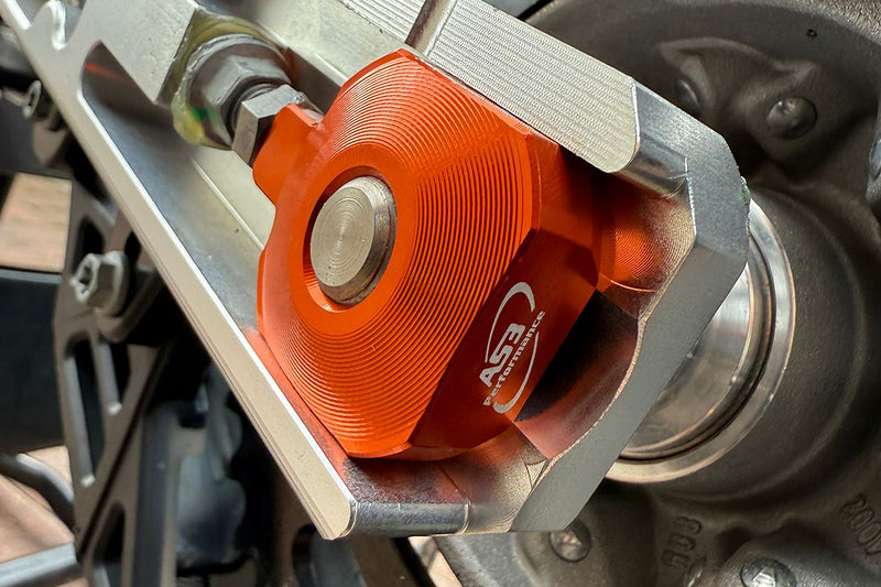 AS3 Performance rear axle blocks are CNC machined from billet aluminium for the perfect fit in the swing arm and around the rear wheel spindle. The alignment scales on the top and bottom of each block are designed to help correctly position the rear wheel. They have a smooth anodised finish and feature AS3 Performance branding on the back of both blocks.