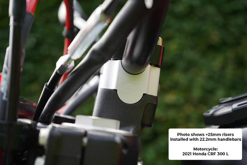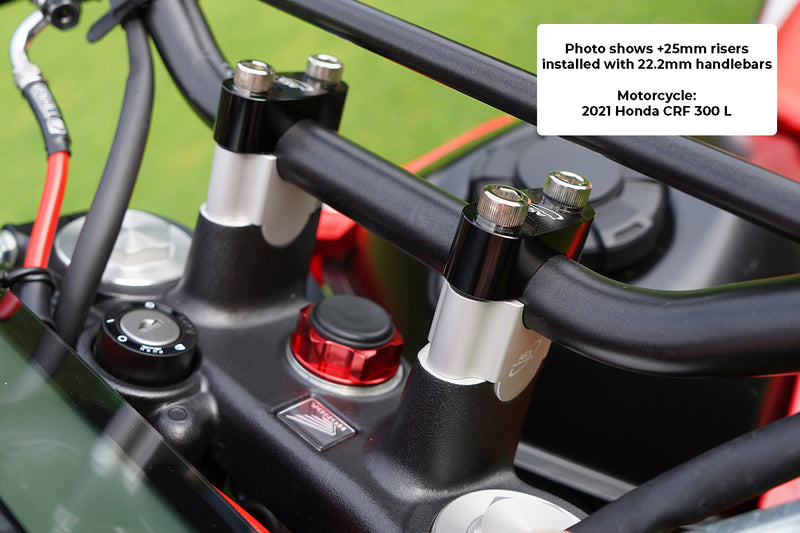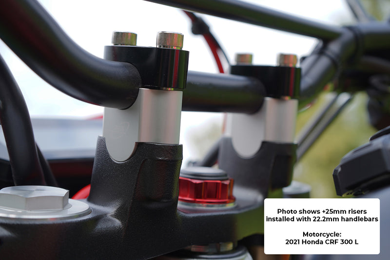 - Check when installing: Different clamps can require different length bolts depending on the thickness of the top part of the handlebar clamp. When installing the handlebar risers make sure the bolts are screwed in to the same depth as the OEM bolts that were removed.
