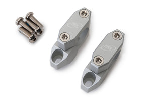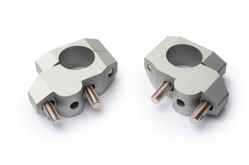 These handlebar clamps are designed to convert 22.2mm handlebars to 28.6mm handlebars. They also raise the bars by 26mm and have a 20mm offset allowing you to move the handlebars closer or further away. The clamps are CNC machined from 6061 billet aluminium and have a matt anodised finish.