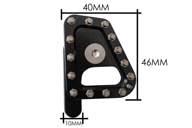 This AS3 Performance oversized flexible rear brake pedal tip can be interchanged on all of our standard rear brake pedals (not including our Factory Series pedals) with no modifications required. The tips have the same spring-loaded pivot design to prevent damage on impact and have approximately a 100% larger surface area than our standard rear brake pedal tips with an extra 5 stainless steel teeth.