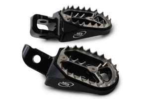 AS3 Performance Factory Series black foot pegs are CNC machined from 6061 billet aluminium and are fitted with stainless steel plates featuring 50 teeth to maintain a high level of grip and durability while keeping the overall weight of the foot pegs to a minimum. The Y shaped centre increases the overall strength of the foot pegs and the 55mm wide platform gives you a larger surface area for your boot than the OEM foot pegs.