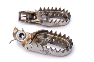 AS3 Performance titanium foot pegs are the strongest and most durable foot pegs that we offer and are the number one choice for all serious racers. They feature a 60mm wide platform giving you a much larger surface area for your boot than the OEM foot pegs and have 48 teeth for superior grip and control. The Y shaped centre of our titanium foot pegs improves the overall strength of the pegs and with a combined weight of only 369g our titanium foot pegs provide a significant weight reduction from the standard OEM foot pegs.