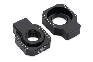 AS3 Performance black rear axle blocks are CNC machined from billet aluminium for the perfect fit in the swing arm and around the rear wheel spindle. The alignment scales on the top and bottom of each block are designed to help correctly position the rear wheel. They have a smooth anodised finish and feature AS3 Performance branding on the back of both blocks.