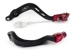 AS3 Performance rear brake pedals and gear levers are cold forged from aluminium to improve the strength of the levers while keeping the overall weight to a minimum. The forging process makes the levers slightly softer than cast or CNC machined levers which reduces the chances of them snapping on impact. They have CNC machined spring loaded tips with knurled groves on the gear lever and 9 stainless steel teeth on the brake pedal.