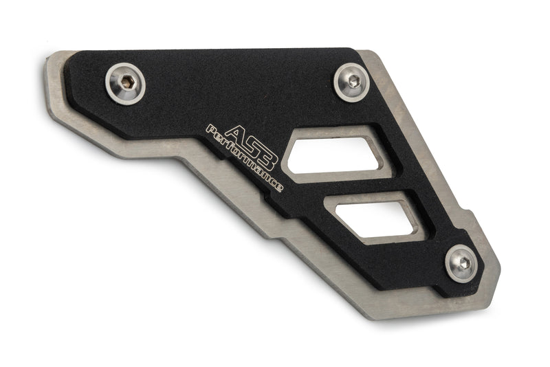 AS3 Performance chain guard fins are constructed by combining a strong 3mm thick stainless steel bracket to provide excellent protection to the chain and rear sprocket and finished off with a lighter aluminium bracket painted in textured black paint with AS3 Performance branding to visually enhance the appearance of the chain guard fin.