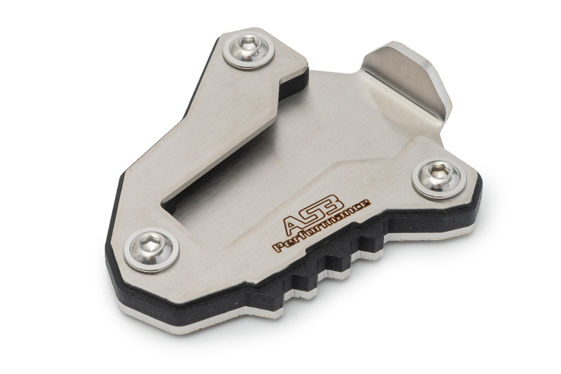 AS3 Performance side stand base extension plates are designed to increase the surface area of the side stand base to make the bike much more stable when parked up on rough or soft ground. They are constructed by combining 2 strong stainless steel plates between a lighter aluminium bracket in a textured black and ice polished finish with AS3 Performance branding.