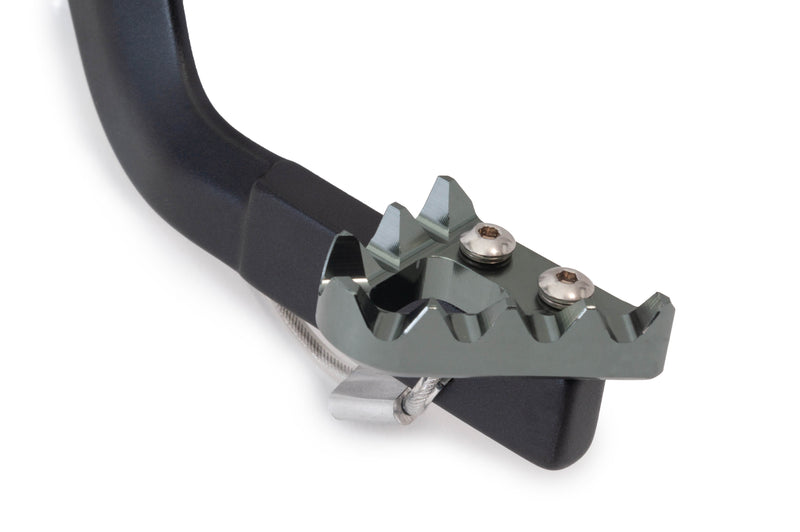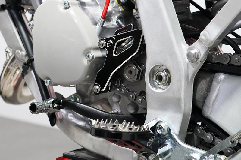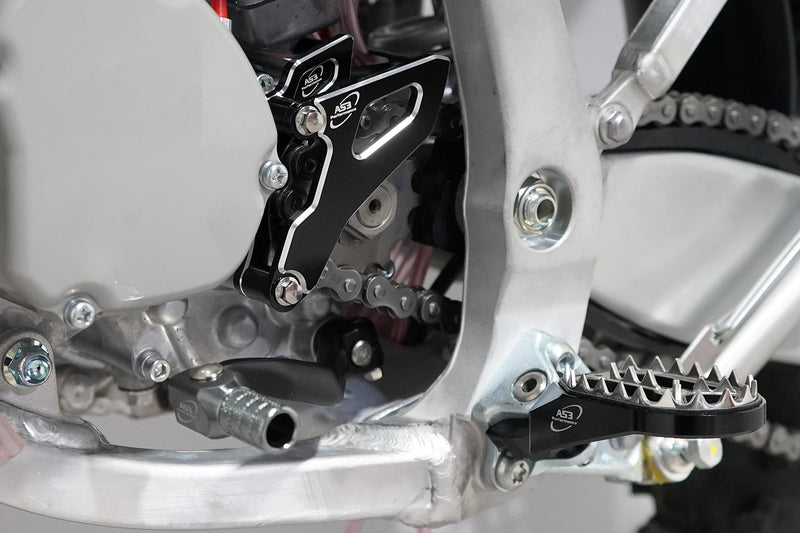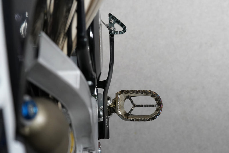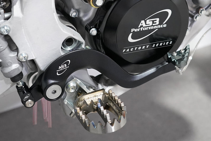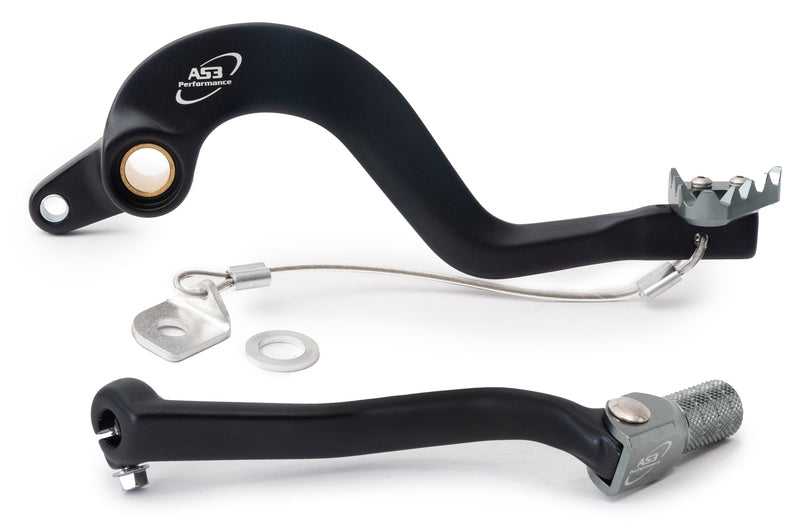 AS3 Performance Factory Series rear brake pedals and gear levers are designed to have a similar look and feel to the OEM levers. Both levers have been sand blasted and then anodised to create a textured matt finish and both the brake pedal and gear lever have a CNC machined titanium coloured tip. The brake pedal tip is fixed like the OEM pedals and features 3 mounting holes allowing you to move the tip closer and further away from the rider. The gear lever tip is spring loaded to prevent damage on impact. The brake pedal also comes with a brake snake cable to help prevent it bending or snapping on impact.