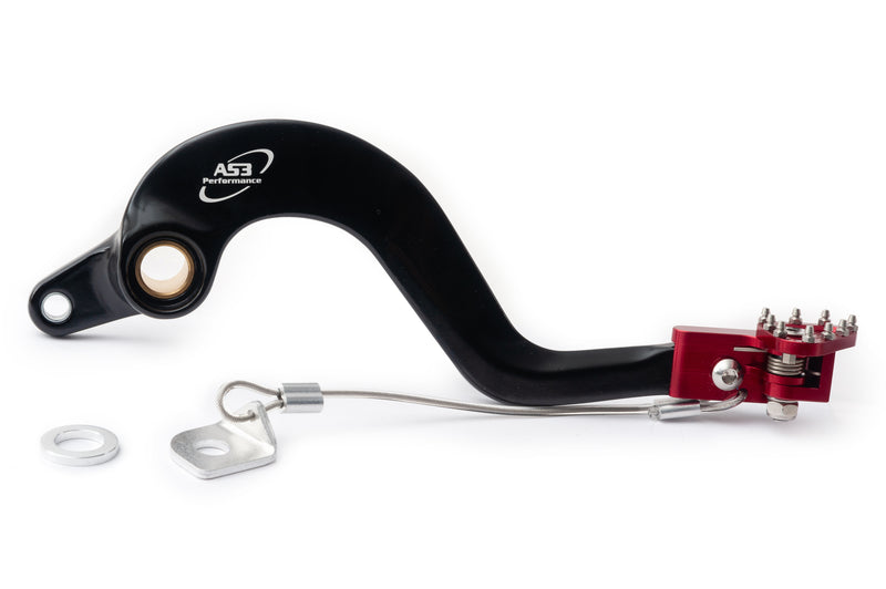 AS3 Performance rear brake pedals are cold forged from aluminium to improve the strength of the pedal while keeping the overall weight to a minimum. The forging process makes the brake pedal slightly softer than cast or CNC machined brake pedals which reduces the chances of it snapping on impact. They have a CNC machined spring loaded tip with 9 replaceable stainless steel teeth and come with a stainless steel brake snake cable which helps prevent the pedal bending if caught on deep ruts or rocks etc.