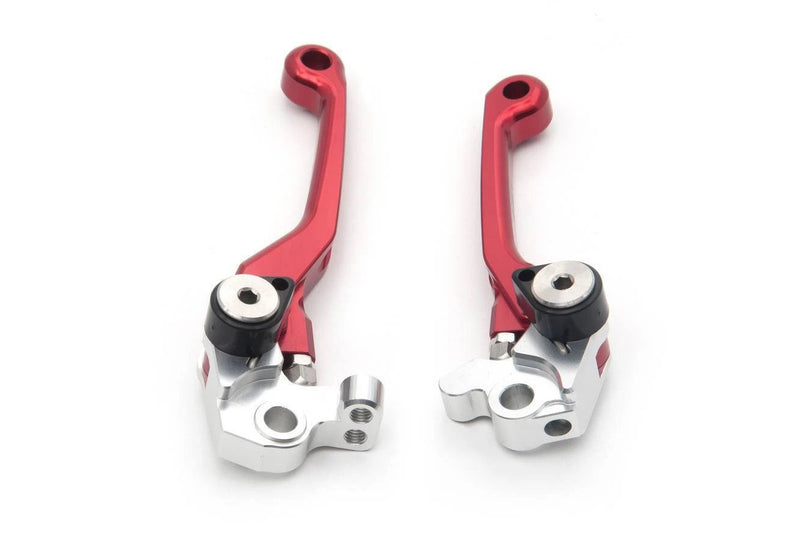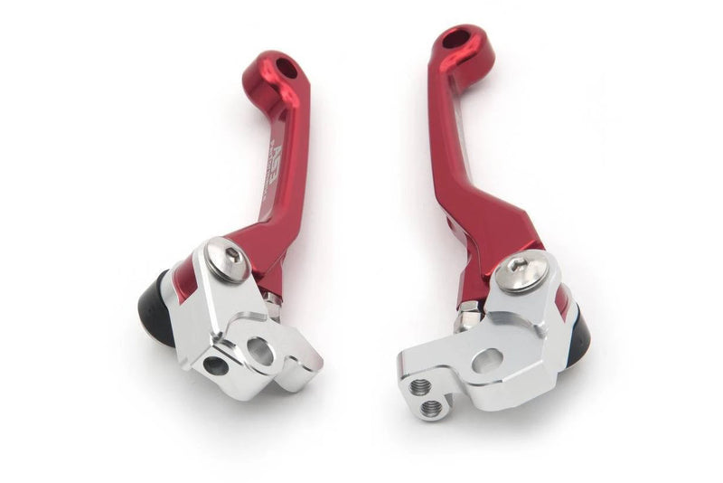 AS3 Performance flexible and adjustable front brake and clutch levers. Manufactured from high-strength aluminium, forged and then CNC machined to guarantee a long life service and a precise fit. The pivot design allows the levers to fold outwards on impact preventing them from breaking or bending. The levers are also have an adjustable reach allowing you to set them at a distance to suit the rider. Anodised in red with grey AS3 Performance logo for that factory look.