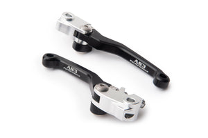 AS3 Performance flexible and adjustable front brake and clutch levers. Manufactured from high-strength aluminium, forged and then CNC machined to guarantee a long life service and a precise fit. The pivot design allows the levers to fold outwards on impact preventing them from breaking or bending. The levers are also have an adjustable reach allowing you to set them at a distance to suit the rider. Anodised in black with grey AS3 Performance logo for that factory look.