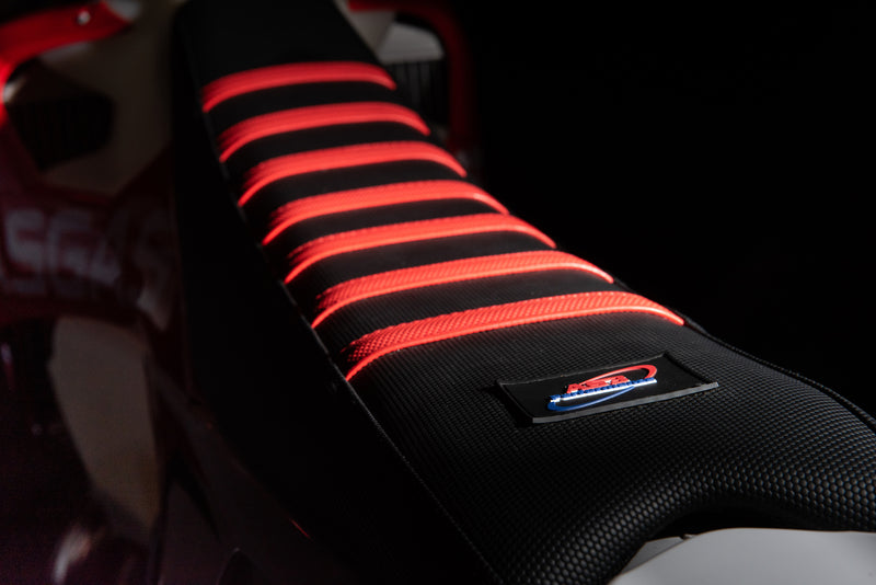 AS3 Performance Ribbed Gripper seat covers feature 5 ribbed traction strips for improved grip and control. The seat covers are made from soft but hard wearing material with double stitched seams for increased strength and durability. With a textured finish, coloured strips and AS3 Performance rubber badge branding they look great on the bike and are a big upgrade on the standard OEM seat covers.