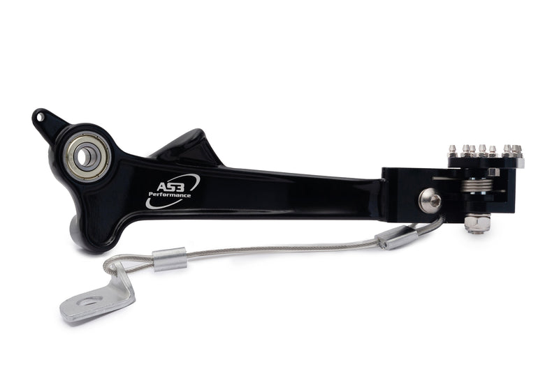 AS3 Performance rear brake pedals are cold forged from aluminium to improve the strength of the pedal while keeping the overall weight to a minimum. The forging process makes the brake pedal slightly softer than cast or CNC machined brake pedals which reduces the chances of it snapping on impact. They have a CNC machined spring loaded tip with 9 replaceable stainless steel teeth and come with a stainless steel brake snake cable which helps prevent the pedal bending if caught on deep ruts or rocks etc.