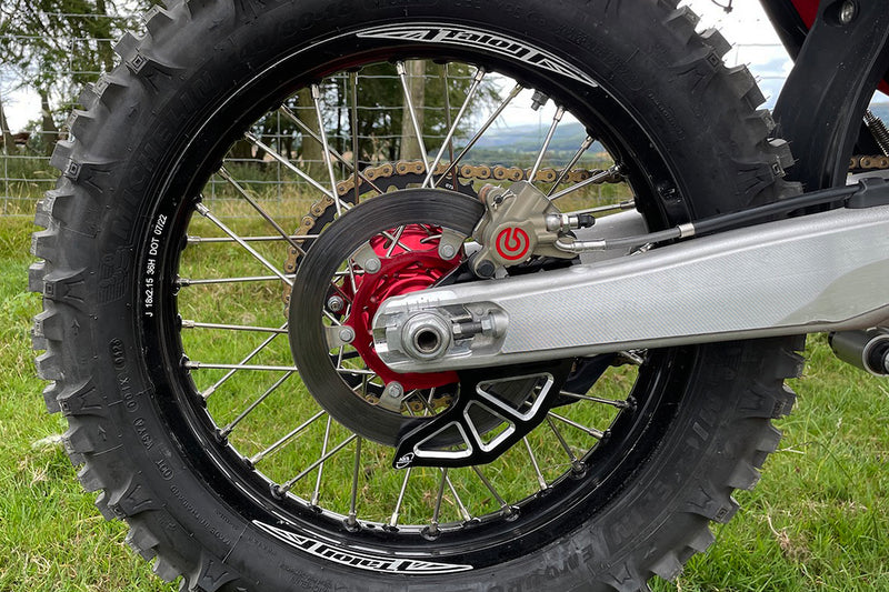 AS3 Performance rear brake disc guards are CNC machined from 6061 billet aluminium to provide maximum protection to the rear brake disc while keeping weight to a minimum. The disc guard comes complete with the rear brake caliper carrier and is the strongest and most secure rear brake disc guard that we offer, ideal for tough extreme enduro conditions and the number one choice for many of our sponsored riders.
