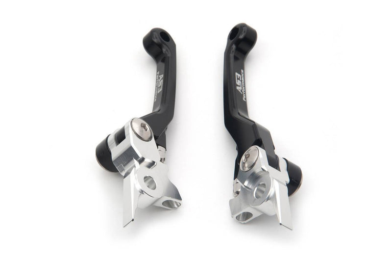 AS3 Performance flexible and adjustable front brake and clutch levers. Manufactured from high-strength aluminium, forged and then CNC machined to guarantee a long life service and a precise fit. The pivot design allows the levers to fold outwards on impact preventing them from breaking or bending. The levers are also have an adjustable reach allowing you to set them at a distance to suit the rider. Anodised in black with grey AS3 Performance logo for that factory look.