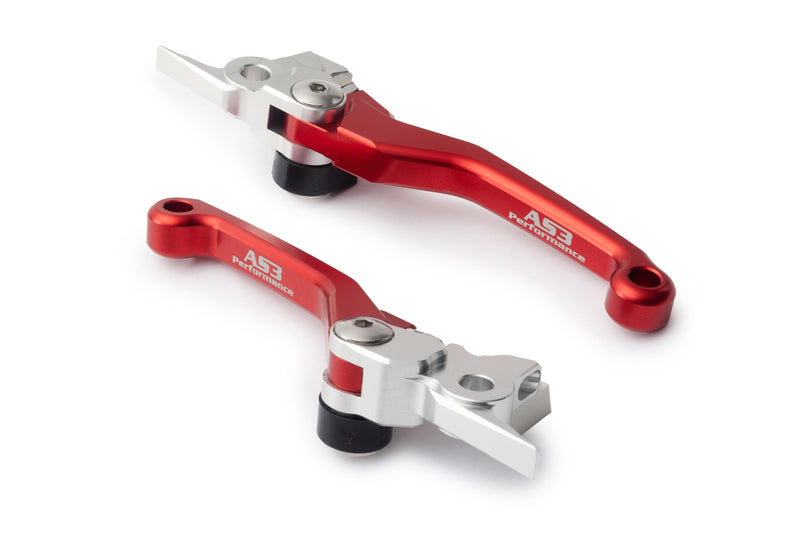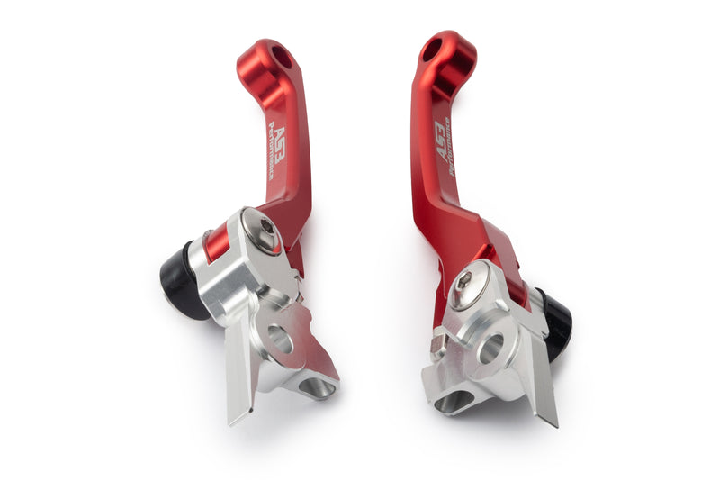 AS3 Performance flexible and adjustable front brake and clutch levers. Manufactured from high-strength aluminium, forged and then CNC machined to guarantee a long life service and a precise fit. The pivot design allows the levers to fold outwards on impact preventing them from breaking or bending. The levers are also have an adjustable reach allowing you to set them at a distance to suit the rider. Anodised in red with grey AS3 Performance logo for that factory look.