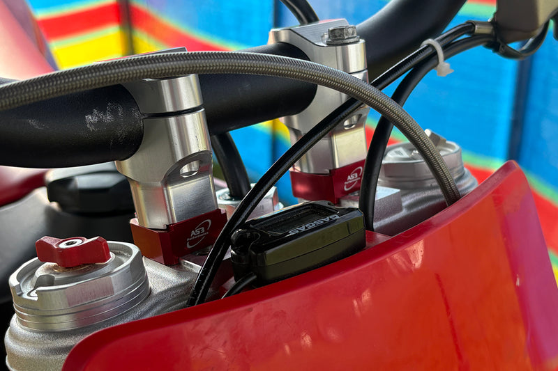 The AS3 Performance bar raiser kit is a simple design consisting 2 small aluminium blocks that slot under the bar clamps and 2 longer bolts which replace the standard bolts in the bar clamps. When fitted the kit raises the handlebars by 10mm.