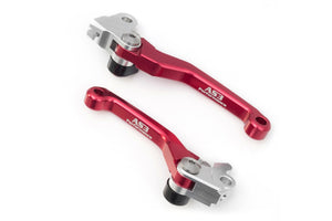 AS3 Performance flexible and adjustable front brake and clutch levers. Manufactured from high-strength aluminium, forged and then CNC machined to guarantee a long life service and a precise fit. The pivot design allows the levers to fold outwards on impact preventing them from breaking or bending. The levers are also have an adjustable reach allowing you to set them at a distance to suit the rider. Anodised in red with grey AS3 Performance logo for that factory look.