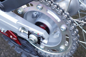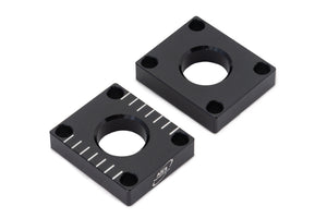 AS3 Performance rear axle blocks are CNC machined from billet aluminium for the perfect fit in the swing arm and around the rear wheel spindle. The alignment scales on the top and bottom of each block are designed to help correctly position the rear wheel. They have a smooth anodised finish and feature AS3 Performance branding on the back of both blocks.