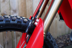 - Designed to clamp the front brake line to the fork guard