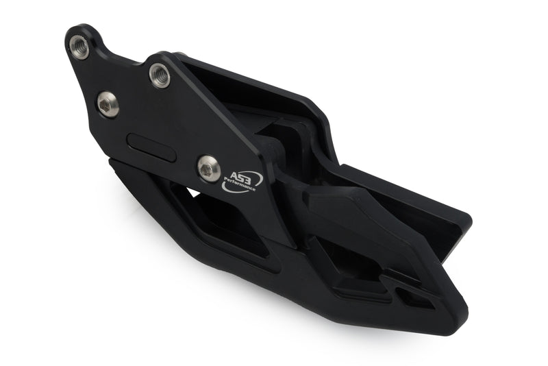 AS3 Performance chain guides have a CNC machined aluminium mounting bracket that provides a firm fixing to the swing arm and the lower part is made from strong, hard wearing plastic which will flex on impact but not bend, giving your rear sprocket maximum protection while keeping the chain running in line.