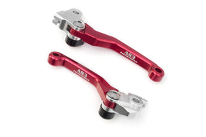 AS3 Performance flexible and adjustable front brake and clutch levers. Manufactured from high-strength aluminium, forged and then CNC machined to guarantee a long life service and a precise fit. The pivot design allows the levers to fold outwards on impact preventing them from breaking or bending. The levers are also have an adjustable reach allowing you to set them at a distance to suit the rider. Anodised in red with grey AS3 Performance logo for that factory look.