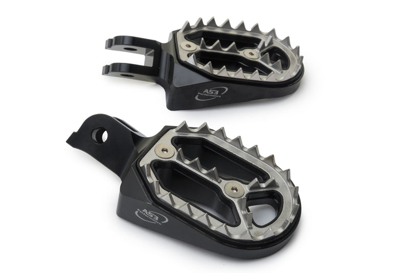 AS3 Performance Factory Series foot pegs are CNC machined from 6061 billet aluminium and are fitted with stainless steel plates featuring 50 teeth to maintain a high level of grip and durability while keeping the overall weight of the foot pegs to a minimum. The Y shaped centre increases the overall strength of the foot pegs and the 55mm wide platform gives you a larger surface area for your boot than the OEM foot pegs.
