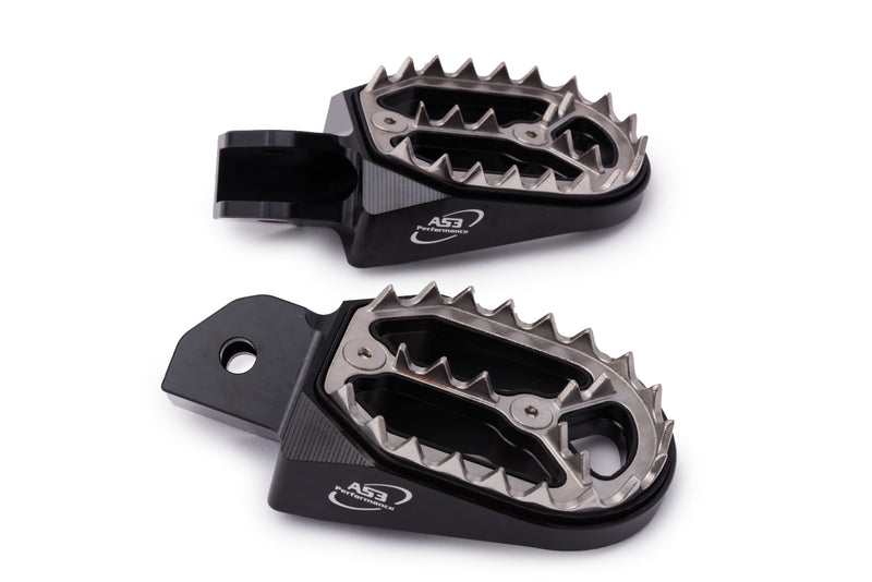 AS3 Performance Factory Series foot pegs are CNC machined from 6061 billet aluminium and are fitted with stainless steel plates featuring 50 teeth to maintain a high level of grip and durability while keeping the overall weight of the foot pegs to a minimum. The Y shaped centre increases the overall strength of the foot pegs and the 55mm wide platform gives you a larger surface area for your boot than the OEM foot pegs.