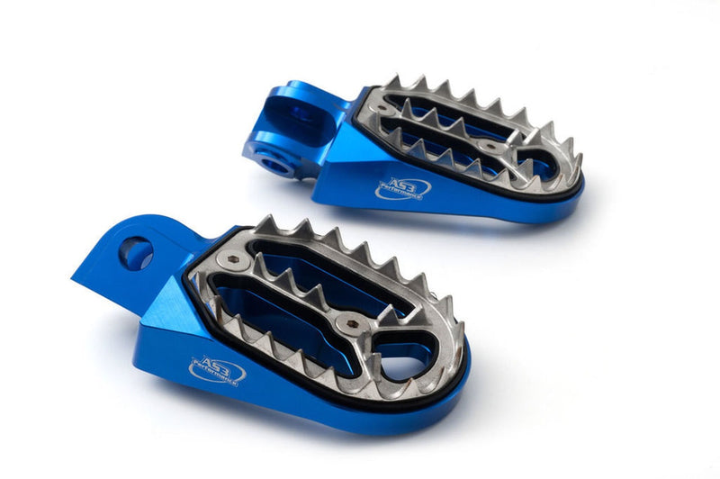 AS3 Performance Factory Series foot pegs are CNC machined from 6061 billet aluminium and are fitted with stainless steel plates featuring 50 teeth to maintain a high level of grip and durability while keeping the overall weight of the foot pegs to a minimum. The Y shaped centre increases the overall strength of the foot pegs and the 55mm wide platform gives you a larger surface area for your boot than the OEM foot pegs.