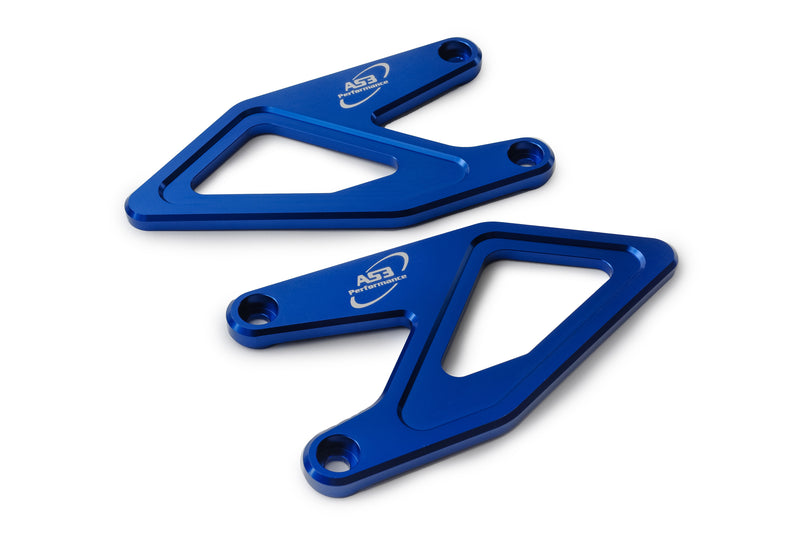 AS3 Performance heel plates are CNC machined from billet aluminium. They have an anodised finish to resist wear and corrosion with AS3 Performance laser etched logos on each plate. The heel plates mount to the bike using the OEM bolts and are a great visual upgrade when installed.