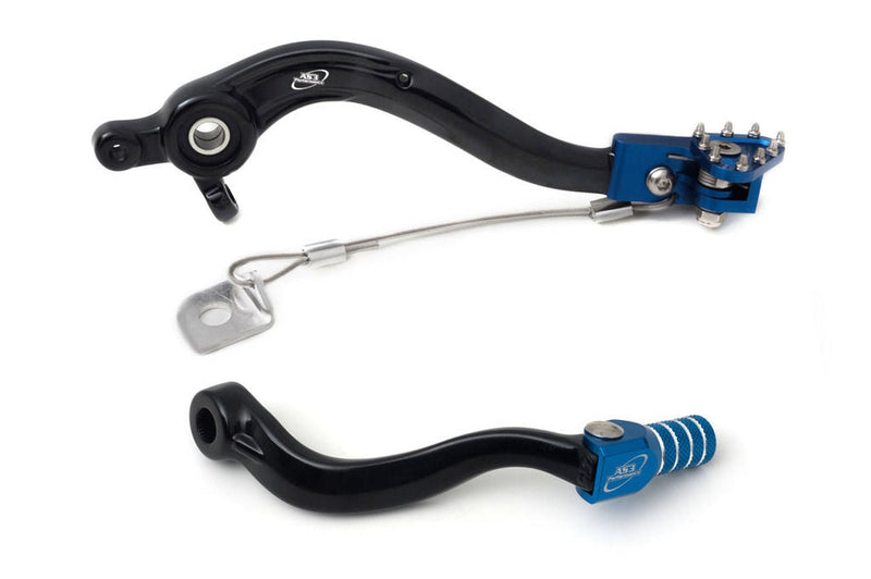 AS3 Performance rear brake pedals and gear levers are cold forged from aluminium to improve the strength of the levers while keeping the overall weight to a minimum. The forging process makes the levers slightly softer than cast or CNC machined levers which reduces the chances of them snapping on impact. They have CNC machined spring loaded tips with knurled groves on the gear lever and 9 stainless steel teeth on the brake pedal.