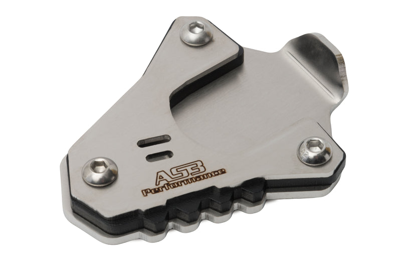 AS3 Performance side stand base extension plates are designed to increase the surface area of the side stand base to make the bike much more stable when parked up on rough or soft ground. They are constructed by combining 2 strong stainless steel plates between a lighter aluminium bracket in a textured black and ice polished finish with AS3 Performance branding.