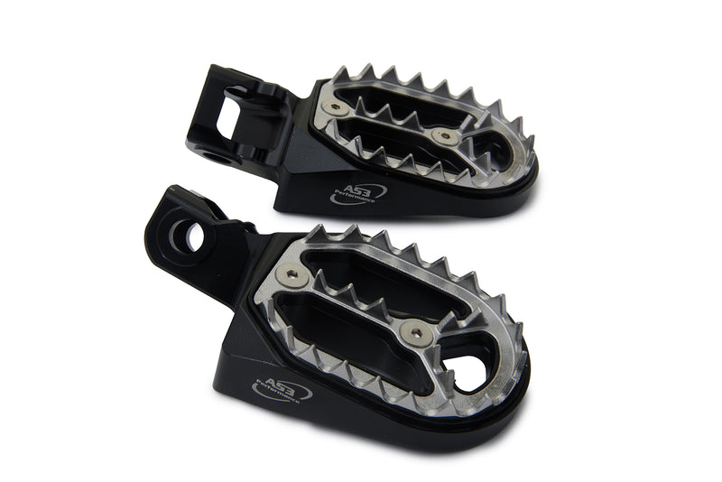 AS3 Performance Factory Series foot pegs are CNC machined from 6061 billet aluminium and are fitted with stainless steel plates featuring 50 teeth to maintain a high level of grip and durability while keeping the overall weight of the foot pegs to a minimum. The Y shaped centre increases the overall strength of the foot pegs and the 55mm wide platform gives you a larger surface area for your boot than the OEM foot pegs.