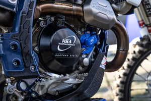 AS3 Performance Factory Series clutch covers are CNC machined from billet aluminium and are stronger and more durable than the standard OEM clutch covers. All AS3 Performance clutch covers are hard anodised to help resist wear from boots and dirt rubbing against the outer face of the cover and feature laser etched AS3 Performance Factory Series branding.