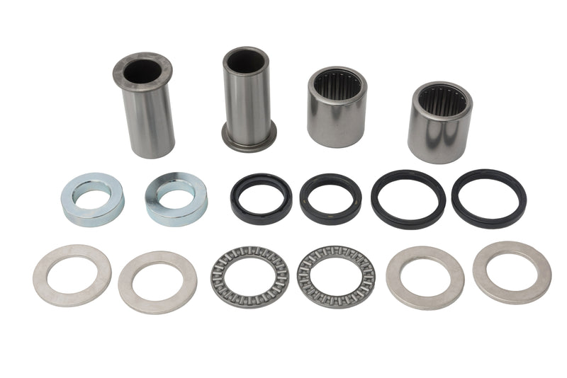 Over time the seals and bearings on the swing arm of a motocross or enduro bike can become worn and fail. Our swing arm bearing kits are supplied with all parts required to restore and repair the swing arm to perfect working order. The kit that you receive will include the exact components shown in the picture.