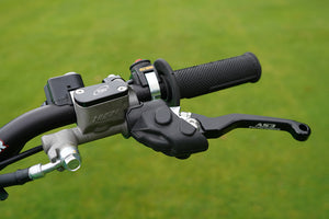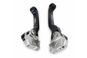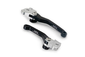 AS3 Performance flexible and adjustable front brake and clutch levers. Manufactured from high-strength aluminium, forged and then CNC machined to guarantee a long life service and a precise fit. The pivot design allows the levers to fold outwards on impact preventing them from breaking or bending. The levers are also have an adjustable reach allowing you to set them at a distance to suit the rider. Anodised in black with grey AS3 Performance logo for that factory look.
