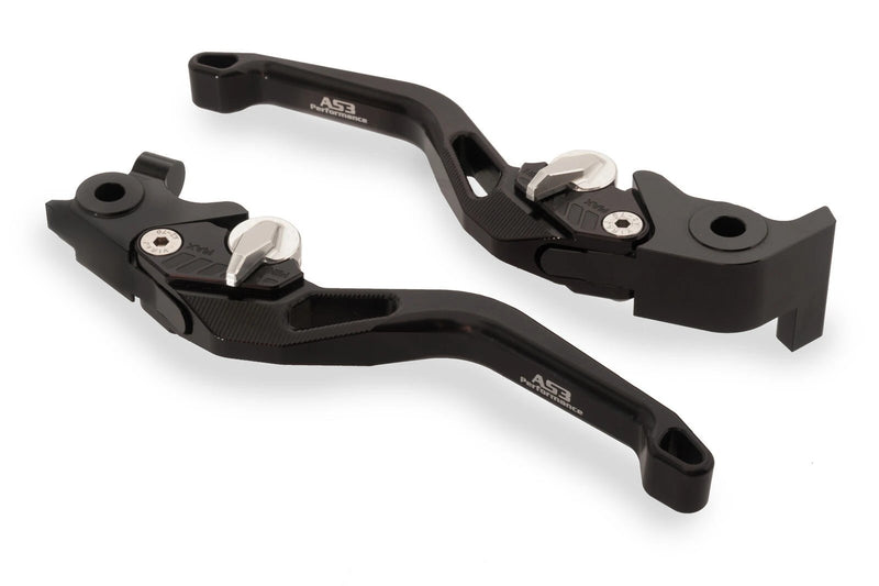 AS3 Performance adjustable front brake and clutch levers are available for a wide range of sports bikes, sports touring bikes and dual sport motorcycles. They are CNC machined from aircraft grade 6061 T6 aluminium and feature a short lever design to allow the rider to control the levers with either 2 or 3 fingers. The levers have 6 adjustable reach settings which can be easily set by using the silver adjuster. They come in a black anodised finish with AS3 Performance branding on the front of the levers.