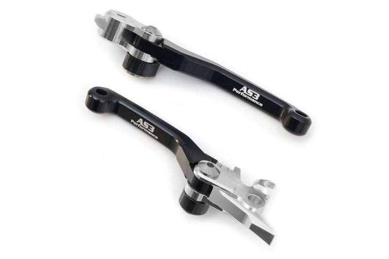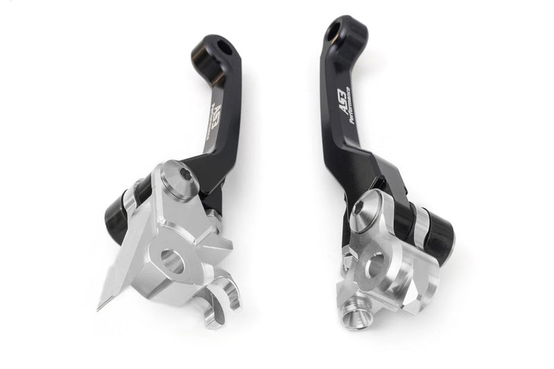 AS3 Performance flexible and adjustable front brake and clutch levers are manufactured from high-strength aluminium, forged and then CNC machined to guarantee a long life service and a precise fit. The pivot design allows the levers to fold outwards on impact preventing them from breaking or bending. The levers are also have an adjustable reach allowing you to set them at a distance to suit the rider. Anodised in black with grey AS3 Performance logo for that factory look.