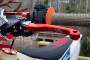 AS3 Performance flexible and adjustable front brake and clutch levers. Manufactured from high-strength aluminium, forged and then CNC machined to guarantee a long life service and a precise fit. The pivot design allows the levers to fold outwards on impact preventing them from breaking or bending. The levers are also have an adjustable reach allowing you to set them at a distance to suit the rider. Anodised in orange with grey AS3 Performance logo for that factory look.
