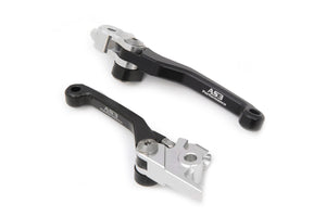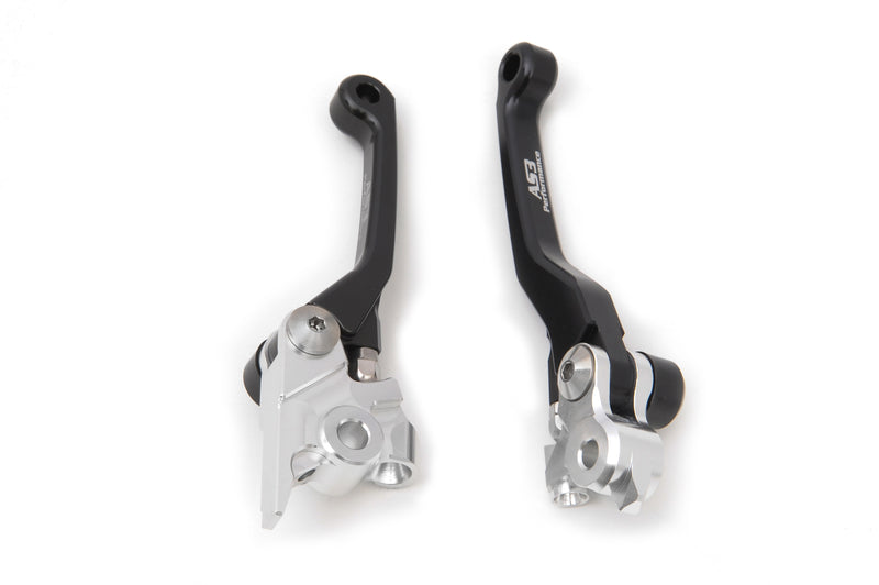 AS3 Performance flexible and adjustable front brake and clutch levers. Manufactured from high-strength aluminium, forged and then CNC machined to guarantee a long life service and a precise fit. The pivot design allows the levers to fold outwards on impact preventing them from breaking or bending. The levers are also have an adjustable reach allowing you to set them at a distance to suit the rider. Anodised in black with grey AS3 Performance logo for that factory look.