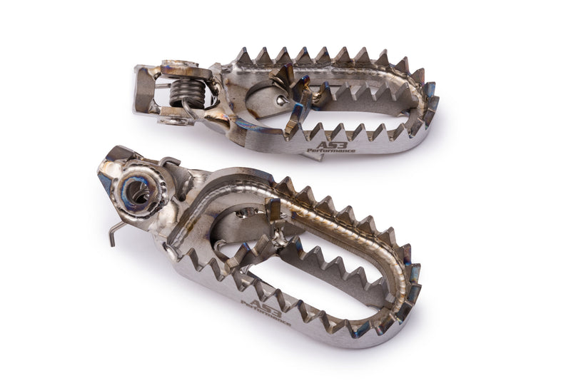 AS3 Performance titanium foot pegs are the strongest and most durable foot pegs that we offer and are the number one choice for all serious racers. They feature a 60mm wide platform giving you a much larger surface area for your boot than the OEM foot pegs and have 58 teeth for superior grip and control. The Y shaped centre of our titanium foot pegs improves the overall strength of the pegs and with a combined weight of only 410g our titanium foot pegs provide a significant weight reduction from the standard OEM foot pegs.