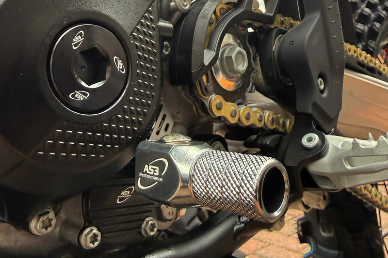 AS3 Performance Factory Series rear brake pedals and gear levers are designed to have a similar look and feel to the OEM levers. Both levers have been sand blasted and then anodised to create a textured matt finish and both the brake pedal and gear lever have a CNC machined titanium coloured tip. The brake pedal tip is fixed like the OEM pedals and features 3 mounting holes allowing you to move the tip closer and further away from the rider. The gear lever tip is spring loaded to prevent damage on impact. The brake pedal also comes with a brake snake cable to help prevent it bending or snapping on impact.