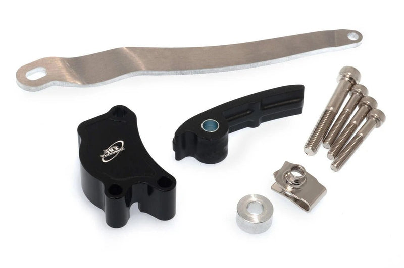 Protect your engine casings and clutch slave cylinder with the AS3 Performance case saver. CNC machined from strong but lightweight 6061 aluminium it provides excellent protection and gives you the confidence to ride as hard as you can without the possibility of an expensive repair to your engine casings or clutch slave cylinder. Anodised in black with AS3 Performance branding and comes with all parts pictured.
