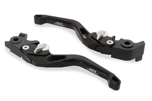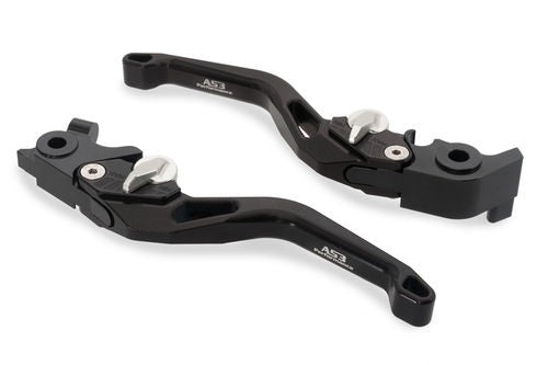 AS3 Performance adjustable front brake and clutch levers are available for a wide range of sports bikes, sports touring bikes and dual sport motorcycles. They are CNC machined from aircraft grade 6061 T6 aluminium and feature a short lever design to allow the rider to control the levers with either 2 or 3 fingers. The levers have 6 adjustable reach settings which can be easily set by using the silver adjuster. They come in a black anodised finish with AS3 Performance branding on the front of the levers.