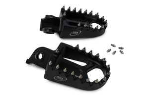 AS3 Performance Racing Series foot pegs are CNC machined from 6061 billet aluminium and feature 32 individual stainless steel teeth to keep the overall weight of the foot pegs to a minimum while maintaining a high level of grip and durability. The Y shaped centre increases the overall strength of the foot pegs and the 57mm wide platform gives you a larger surface area for your boot than the OEM foot pegs.