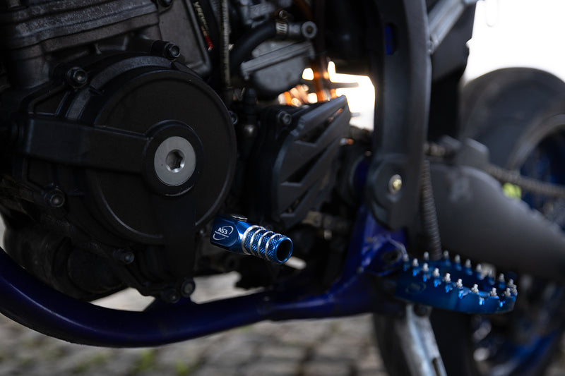 AS3 Performance rear brake pedals and gear levers are cold forged from aluminium to improve the strength of the levers while keeping the overall weight to a minimum. The forging process makes the levers slightly softer than cast or CNC machined levers which reduces the chances of them snapping on impact. They have CNC machined spring loaded tips with knurled groves on the gear lever and 9 stainless steel teeth on the brake pedal.