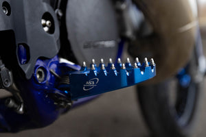 AS3 Performance Racing Series foot pegs are CNC machined from 6061 billet aluminium and feature 34 individual stainless steel teeth to keep the overall weight of the foot pegs to a minimum while maintaining a high level of grip and durability. The Y shaped centre increases the overall strength of the foot pegs and the 57mm wide platform gives you a larger surface area for your boot than the OEM foot pegs.